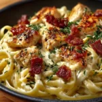 7. Serve hot, garnished with chopped chives or parsley and an extra sprinkle of Parmesan. The first forkful should be a balance of creamy sauce, tender chicken, and that satisfying bacon crunch.