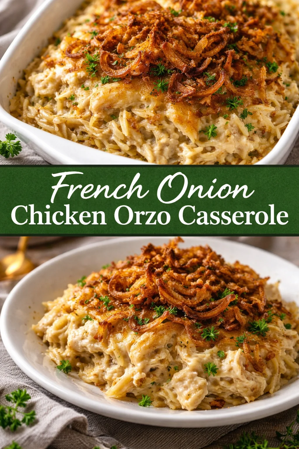 There are dinners that fill the belly and dinners that warm the heart — this French Onion Chicken Orzo Casserole is both. Imagine the moment you lift the foil and a slow, caramelized onion aroma curls out, ribbons of melted cheese stretching as you scoop a portion onto a plate. This French Onion Chicken Orzo Casserole has become my family’s favorite comfort food on busy weeknights and special Sundays alike, turning ordinary ingredients into something quietly celebratory. If you like comforting food with a little everyday magic, you might also enjoy checking out this alternate skillet version for a quicker twist: alternate skillet version.