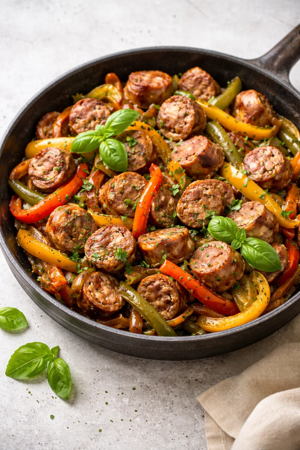 Enjoy your Italian Sausage and Peppers Skillet over a bed of steaming pasta, or serve it alongside a thick slice of crusty bread for sopping up all that deliciousness. A fresh side salad drizzled with vinaigrette brightens the meal. For drinks, a glass of red wine like Chianti perfectly complements the rich flavors.