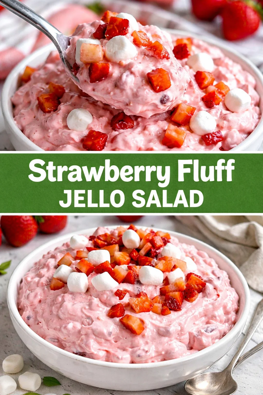 This Strawberry Fluff Jello Salad is one of those recipes that carries more than flavor — it carries memory. It’s easy to make, endlessly adaptable, and always a hit whether you are pulling together a quick family meal or adding a nostalgic, festive dish to your party table. Try it this week, share a bowl with someone you love, and let the bright strawberry sweetness start a new tradition.