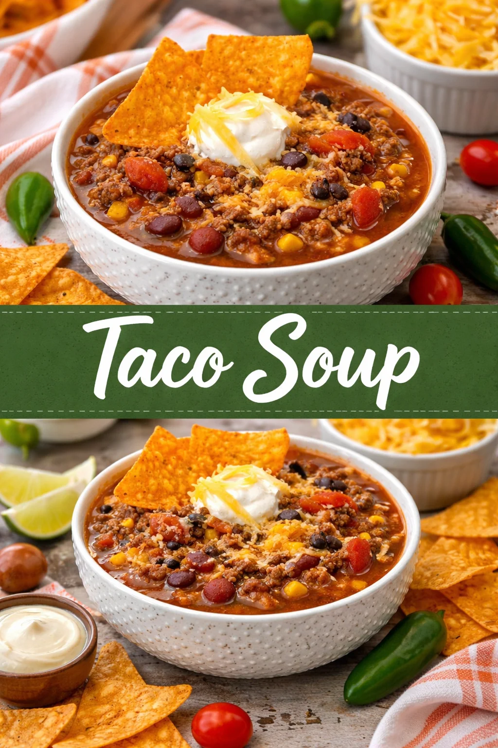 A warm, comforting taco soup filled with hearty beans, juicy tomatoes, and seasoned ground meat, perfect for cozy evenings and family gatherings.