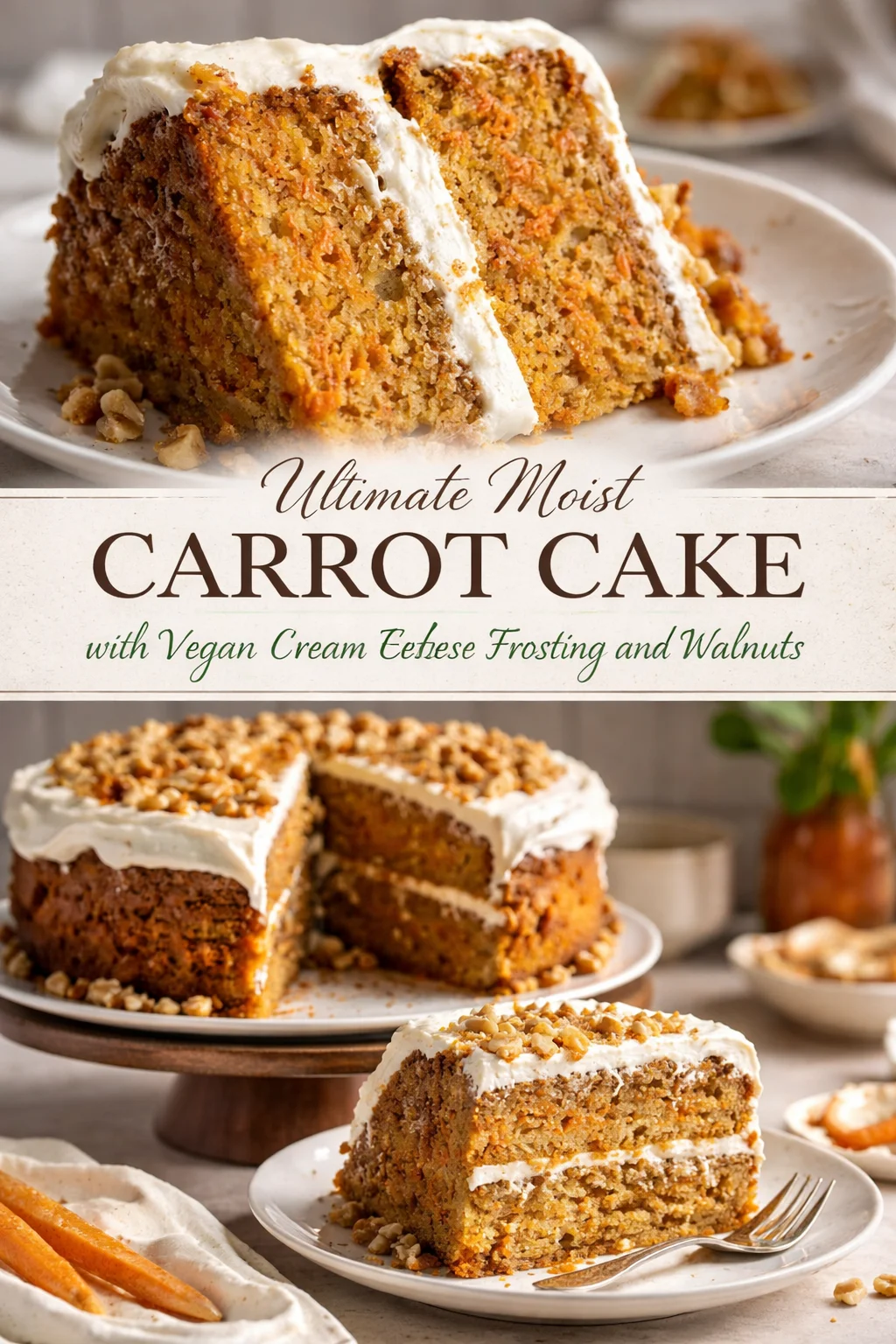 Ultimate Moist Carrot Cake with Vegan Cream Cheese Frosting and Walnuts