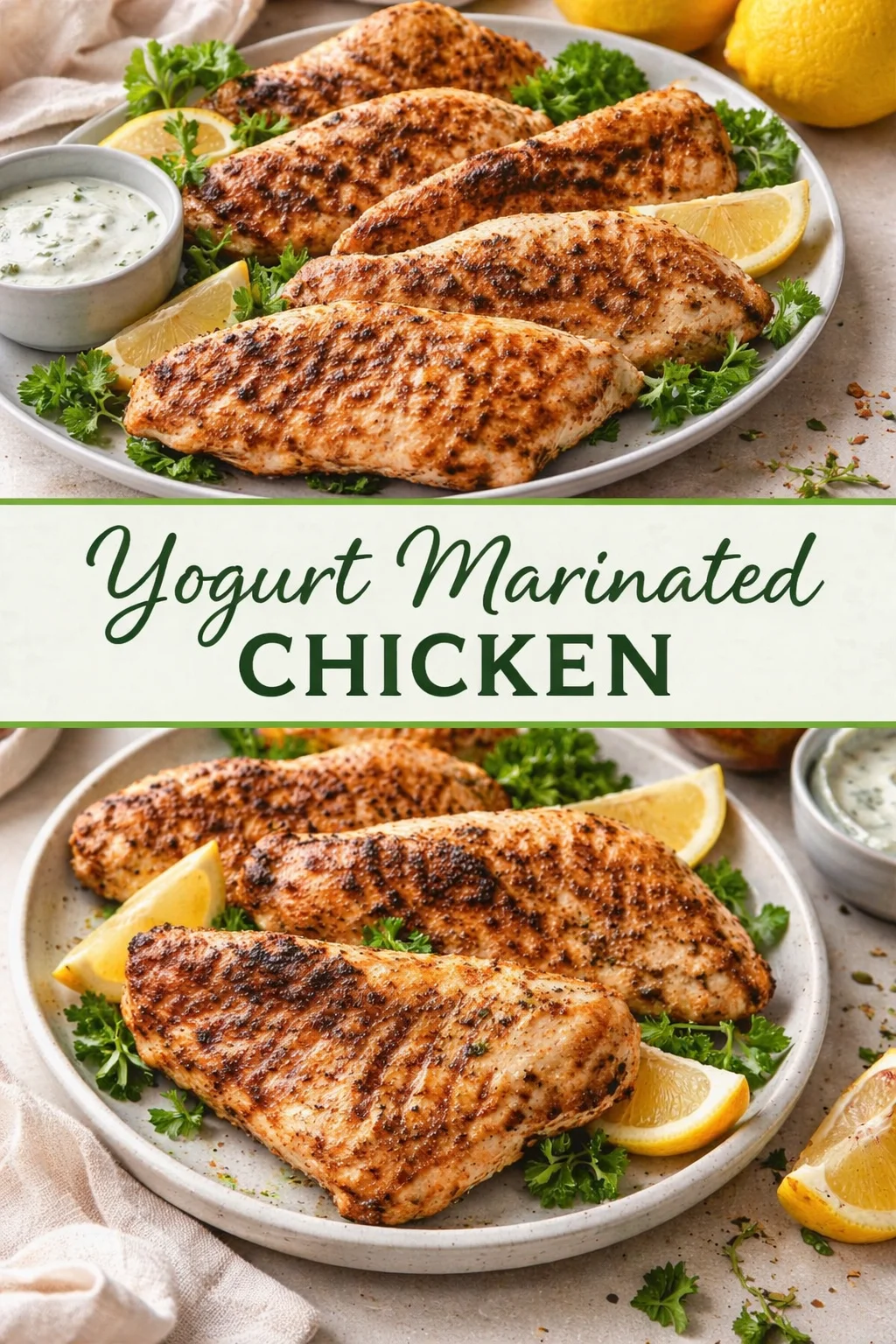 Serve this Yogurt Marinated Chicken over fluffy basmati rice, tucked into warm flatbreads with pickled onions and tahini, or alongside a crisp salad of cucumber, tomato, and herbs. For drinks, a crisp white wine or a sparkling lemonade balances the yogurt’s tang. Picture a cozy table, laughter, and the sound of pita tearing as steam rises from each plate — this is comforting food that connects.